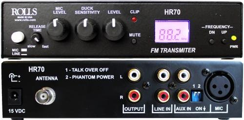 The HR70 is an analog FM broadcast transmitter. Can accept either a XLR (MIC/Line Level) and/ or RCA (LINE Level) inputs for the HR70. Selectable frequency range (87.5 to 108 MHz) to broadcast within. The HR70 also has a talk over circuit built in, called “Ducking” allowing announcements to be heard over the broadcasted program without stopping it. The HR70 is a micro power RF transmitter and requires no FCC license. The transmitter includes a wire antenna that is set up for the middle of the band or about 92MHz.